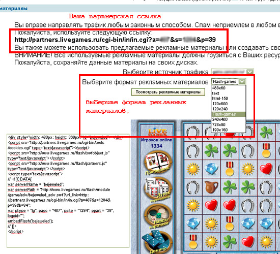- Поставить баннеры или flash игры из личного кабинета партнера